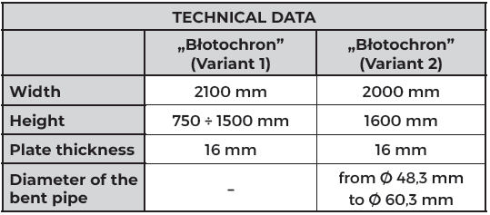 with a polycarbonate plate fixed in a C-channel cap to a bent pipe. Segment made of a polycarbonate plate, the lower and upper edge of the plate equipped with stiffening caps made of a steel C-channel. Fence segment fixed to a handrail made of a pipe with a diameter from 48.3 mm to 60.3 mm. The barrier is mounted in the ground – embedded in a concrete foundation to a depth of min. 400 mm or attached to the substrate using a steel sheet foot.