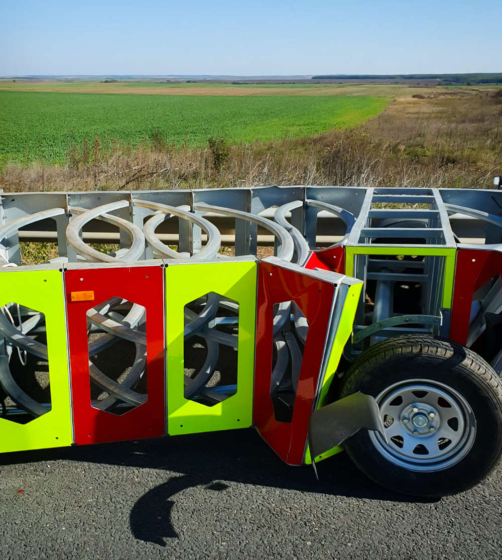 The ElipSafe Elliptical Mobile Crash Cushion is designed to protect temporary roadworks, service vehicles, and incident sites within the road lane, safeguarding personnel and equipment against the effects of collisions. Its innovative design a proprietary solution developed by WIMED engineers is fully hot-dip galvanized (per EN ISO 1461) and utilizes specially curved absorbing modules for progressive kinetic energy absorption. This performance is confirmed by full compliance with the CEN/TS 16786 standard, achieved during the very first attempt of every crash test.
