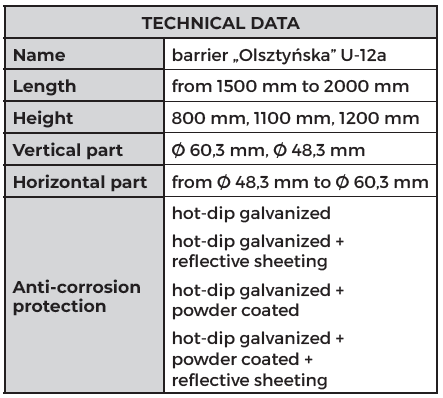 The U-12a „Olsztyńska” barrier is used to protect pedestrians and separate them from the roadway, to prevent them from crossing the roadway in unauthorized places. The fences are placed next to the roadway, on sidewalks, on the edge of the shoulder, on the median strip, or on tram islands from the roadway side to fence off the tracks.