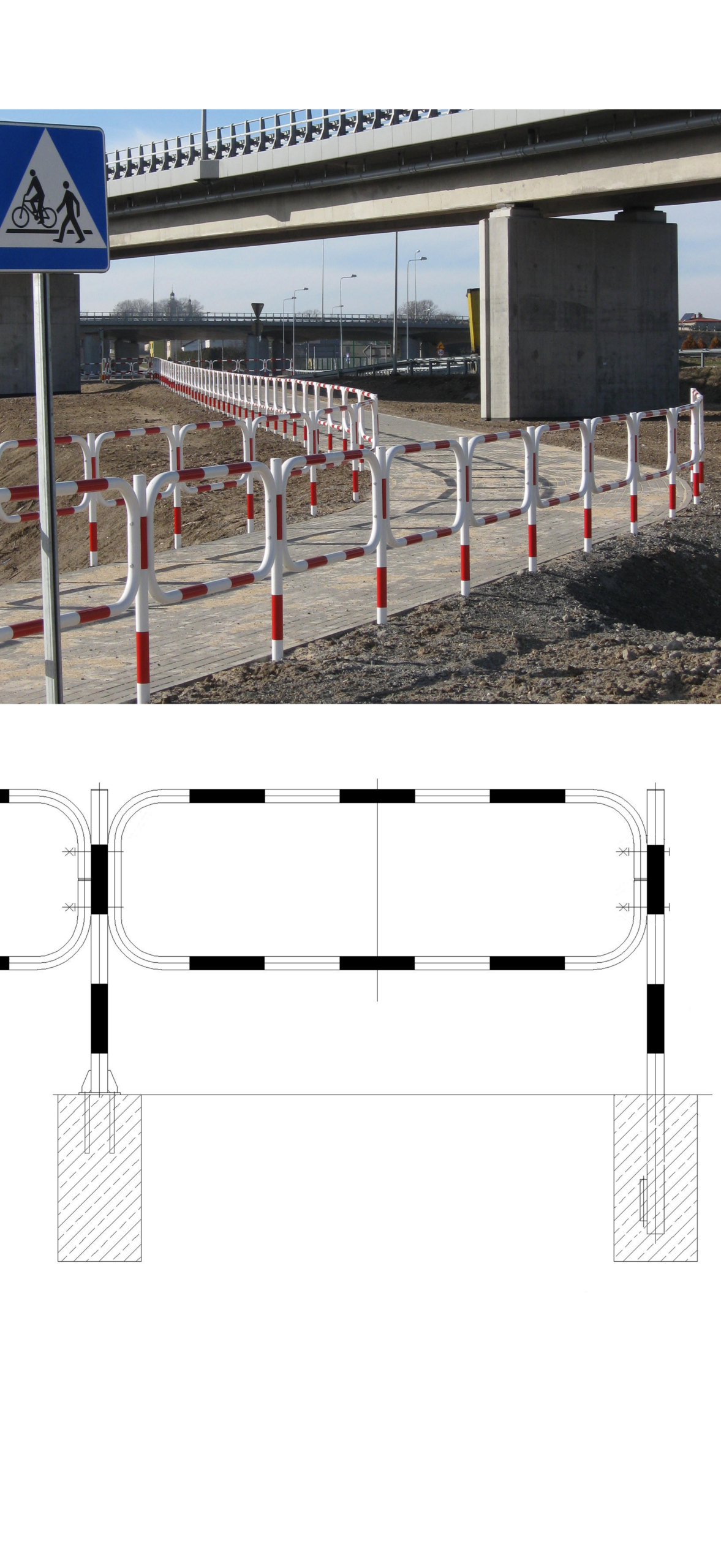 The U-12a „Olsztyńska” barrier is used to protect pedestrians and separate them from the roadway, to prevent them from crossing the roadway in unauthorized places. The fences are placed next to the roadway, on sidewalks, on the edge of the shoulder, on the median strip, or on tram islands from the roadway side to fence off the tracks.