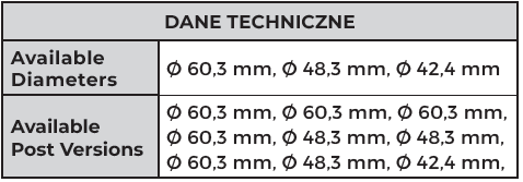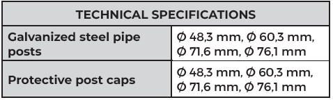 Galvanized steel pipes with standard diameters of 48.3 mm, 60.3 mm, 71.6 mm, and 76.1 mm are used in the production of the posts, with the option of an additional lacquer coating.