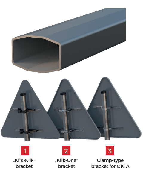 The innovative OKTA system is a solution that allows for tool-free sign installation in just 10 seconds (confirmed by a distinctive “click”), while the unique post shape provides 100% protection against the sign rotating in the wind. The system combines the speed of the “Click-click” bracket with the durability of an elliptical profile (dimensions: 64 x 40 mm, thickness: 1.5 – 2.5 mm). It maintains full versatility and compatibility with both “Click-click” and traditional “Ząbek” (toothed) brackets. The product is fully compliant with the EN 12899-1 standard, and the use of zinc coatings ensures long-term corrosion resistance and a natural appearance.