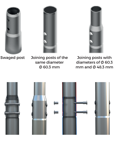 Galvanized steel pipes with standard diameters of 48.3 mm, 60.3 mm, 71.6 mm, and 76.1 mm are used in the production of the posts, with the option of an additional lacquer coating.