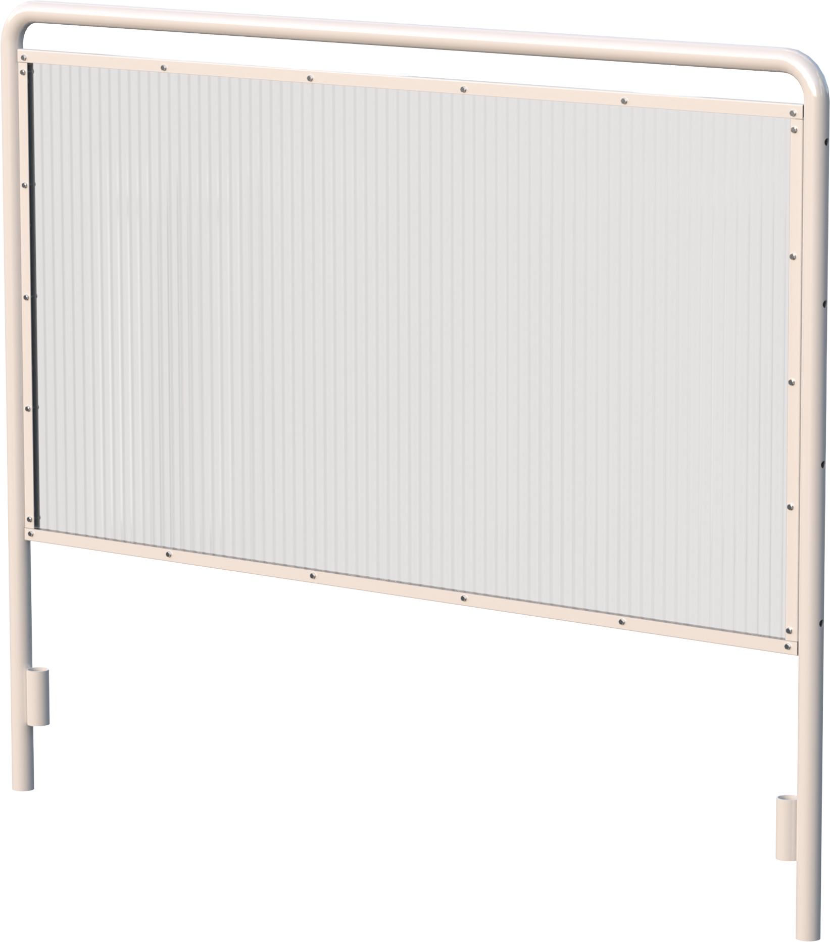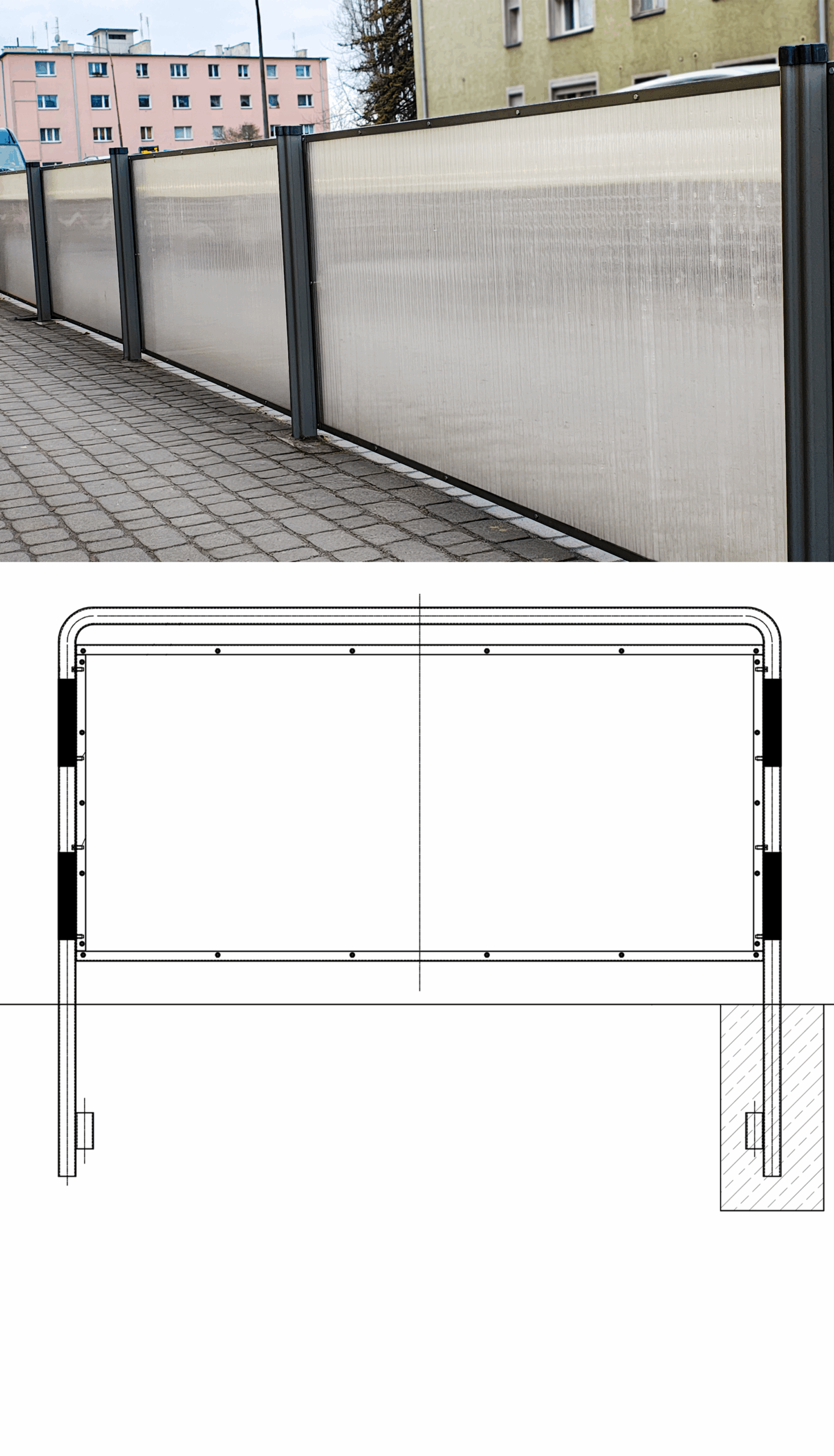 z płytą poliwęglanową mocowaną w nakładce ceowej do rury giętej. Segment wykonany z płyty poliwęglanowej, dolna i górna krawędź płyty wyposażona w nakładki usztywniające ze stalowego ceownika. Segment ogrodzenia mocowany do pochwytu wykonanego z rury o średnicy od 48,3 mm do 60,3 mm. Barierka montowana jest w gruncie – osadzana w fundamencie betonowym na głębokość min. 400 mm lub przymocowana do podłoża za pomocą stopy z blachy stalowej.