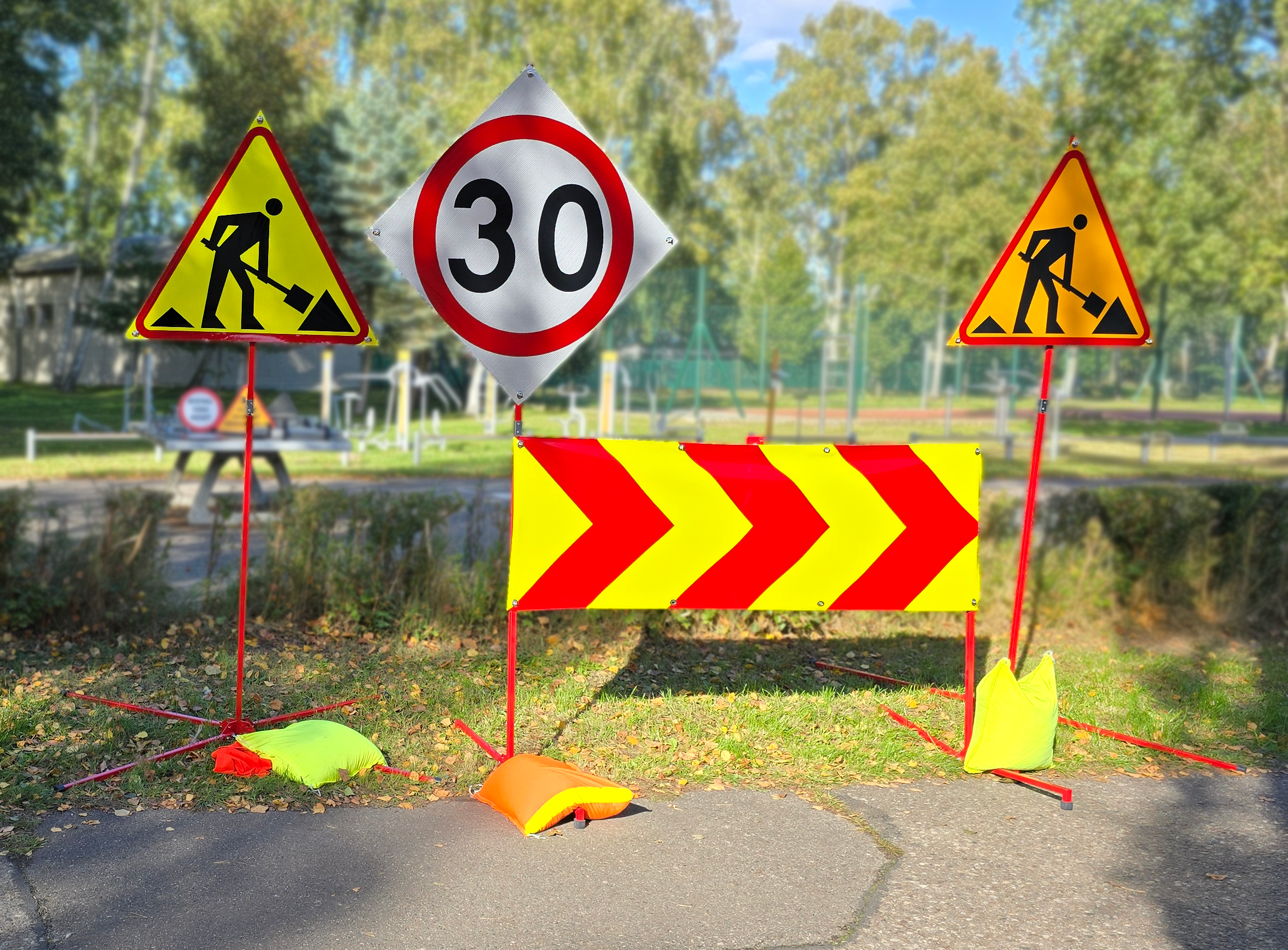 Odblaskowe znaki zwijane, szybkie w montażu i demontażu, to doskonałe rozwiązanie do czytelnego i bezpiecznego oznakowania robót drogowych, wypadków czy kolizji. To praktyczne rozwiązanie do oznakowania tymczasowego. Zastosowana folia jest elastyczna i wysokoodblaskowa, a dzięki systemowi metalizowanych mikropryzmatów gwarantuje doskonałą widoczność znaku w każdych warunkach oświetleniowych. W celu dodatkowej stabilizacji można skorzystać z dedykowanych worków z piaskiem, które dzięki jaskrawym kolorom i taśmie odblaskowej jeszcze bardziej podkreślają widoczność całego zestawu.