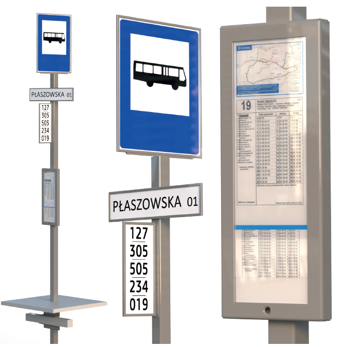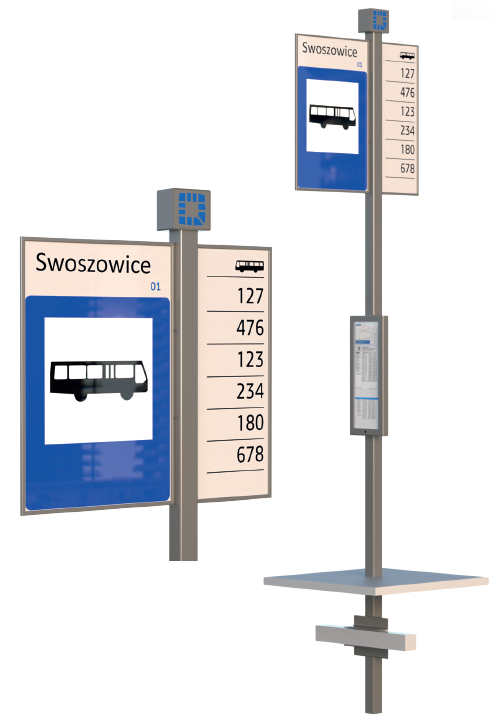 System przeznaczony do oznakowania przystanków, zawierający znaki typu D, nazwę przystanków, rozkład jazdy, a także z możliwością umieszczenia numeracji linii. Rozkład jazdy może zostać umieszczony w formie kieszeni wsuwalnej, naklejonej grafiki oraz przezroczystej gabloty zamykanej systemowo, z możliwością wymiany grafiki.