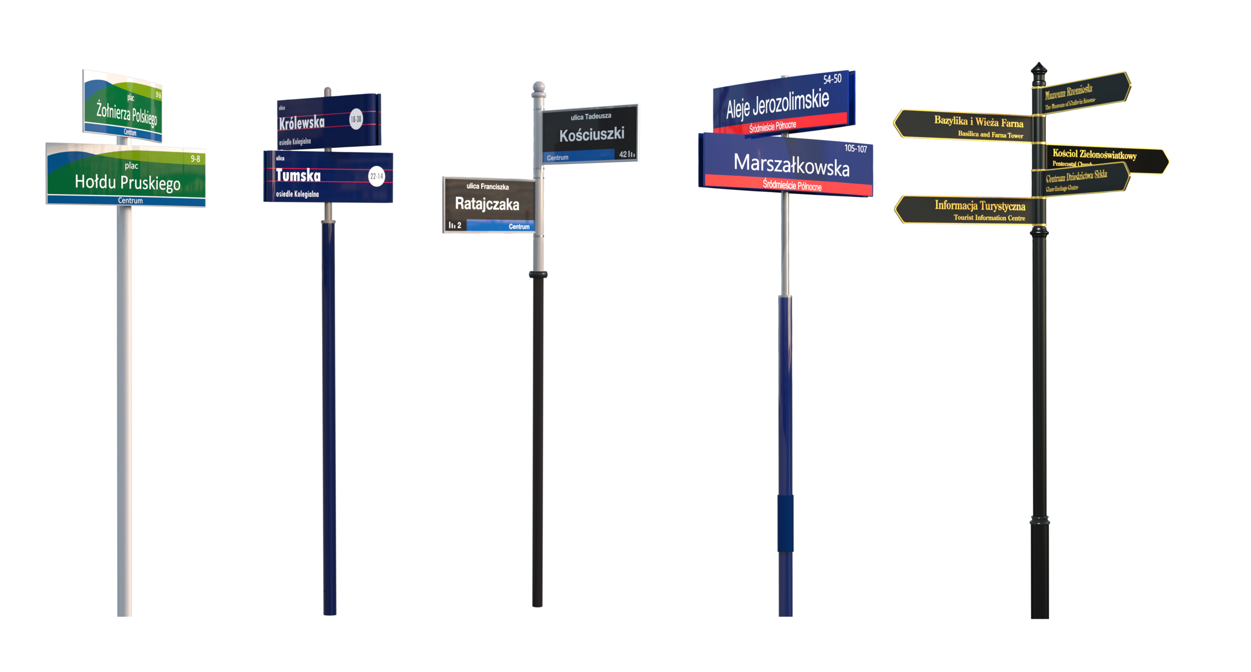Elementy Systemów Informacji Miejskiej oferowane są w czterech standardach wizualnych: ekonomicznym, przetłaczanym, stylizowanym i nowoczesnym, dzięki czemu istnieje pełna możliwość doboru elementów systemu... więcej